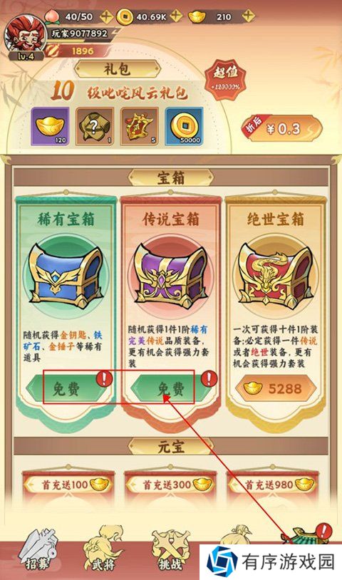 在首页点击右下角的“商城”,即可看到有两个免费宝箱可以领取,领取后打开可以获得高级装备。