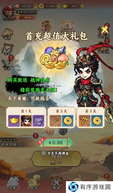 玩家进入游戏后,点击上方的“首充”,0.06即可解锁首充礼包,能领取战将吕布。