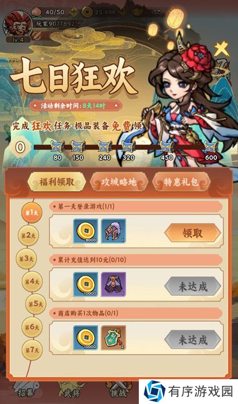 点击七日签到活动下方的“七日狂欢”即可进入,累计七日,每日完成任务都可以获得丰富的奖励。