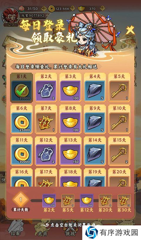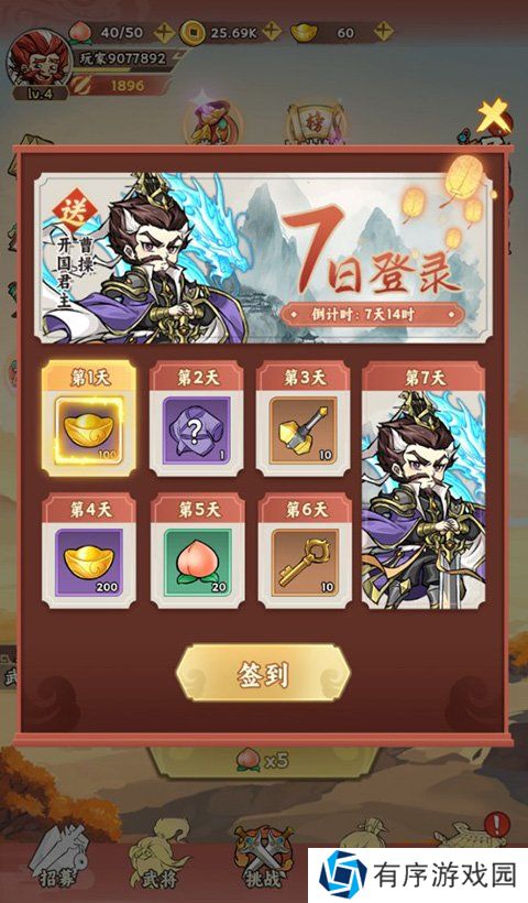 点击右上角的七日签到,即领取新手七日签到礼包,第七日可以领取枭雄曹操。