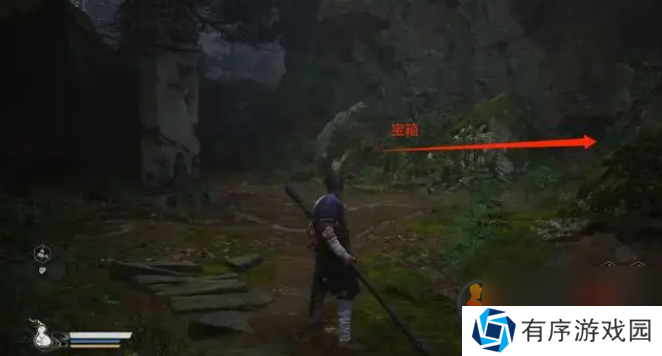 出洞沿主干道往前走,路过一个石碑前往右走,可以发现一个宝箱,拿完继续上路。