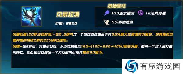 被动-风暴狂涌:2秒后,风暴狂涌用闪电打击目标,对其造成100-200(基于等级)(+50%法强)魔法伤害。