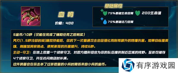 辅助任务:使用这个装备赚取500金币来将其转变为【符文罗盘】,并提供持有守卫的能力。
