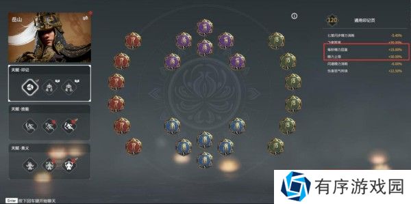 在永劫无间游戏中天赋印记是非常重要的,合理的加点可以为玩家带来顺畅的手感,岳山天赋印记推荐红精力恢复,绿精力上限,蓝钩锁距离,紫:6精力消耗或3伤转怒、3攻转怒,战斗中闪避精力是很重要的。